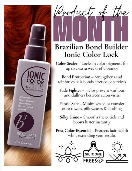 Brazilian Blowout Ionic Color Lock is a lightweight spray that seals in color, boosts shine, and helps prevent fading after your service. It’s silicone-free, smells amazing, and keeps your color looking salon-fresh longer. Take 20% off all October!